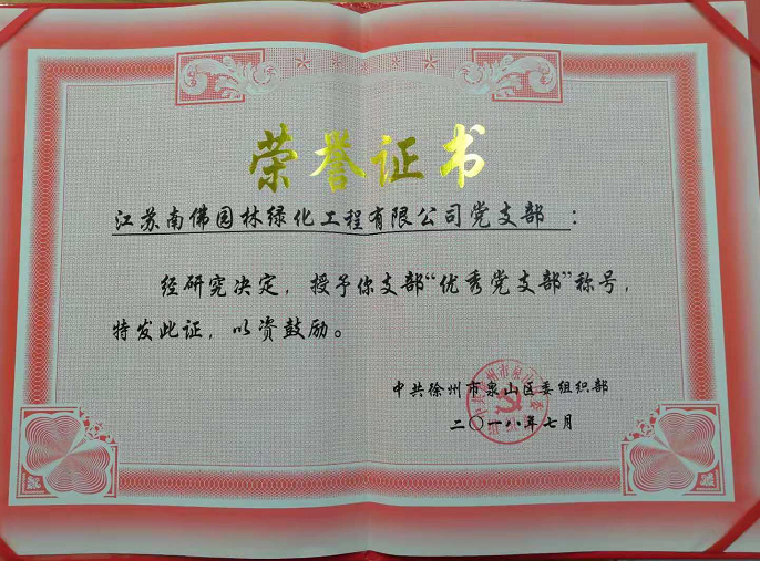 江苏问鼎中国有限公司官网绿化工程有限公司在2018年度党建工作中成绩优异,业绩突出,荣获“优秀党支部”荣誉称号。